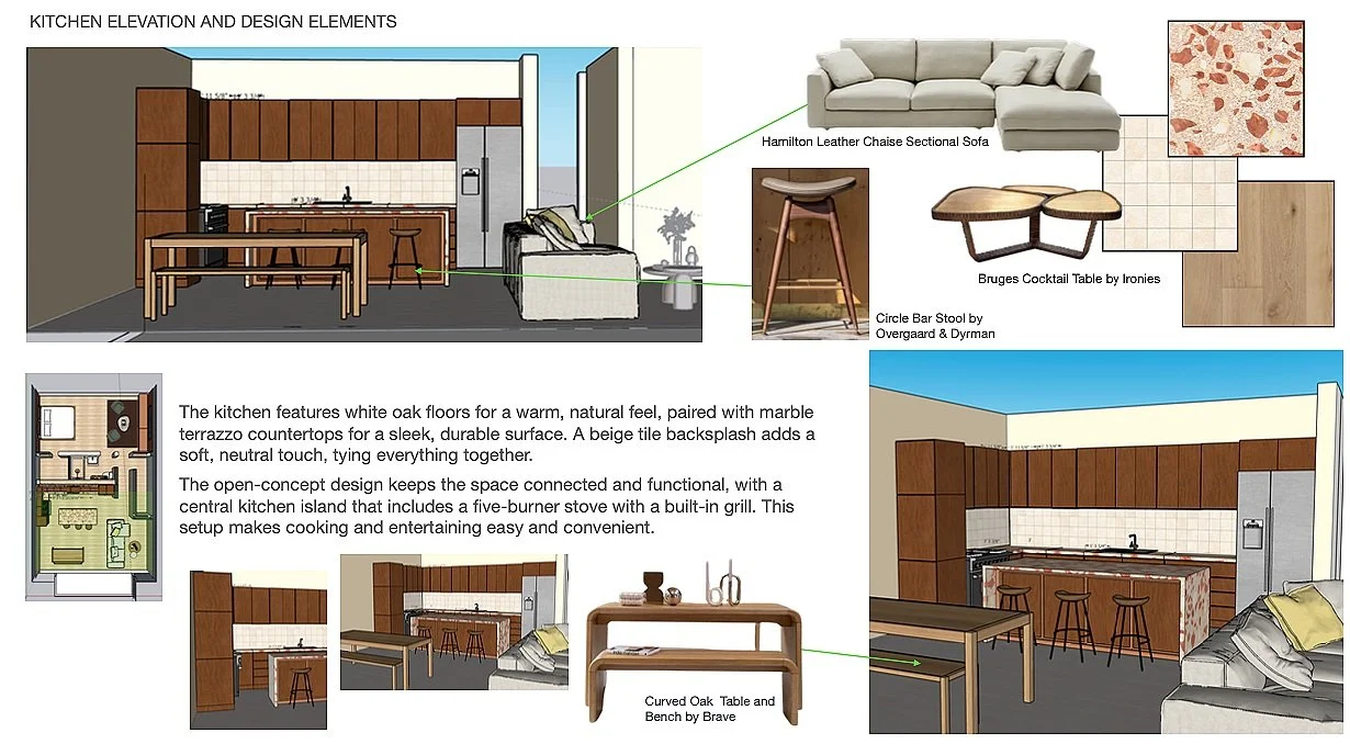 The layout includes a beautiful blend of clean lines, natural materials, and strategic spatial arrangements, bringing a sense of openness and tranquility to the space. The contemporary kitchen seamlessly flows into the living area, fostering an inviting atmosphere for both relaxation and entertaining.